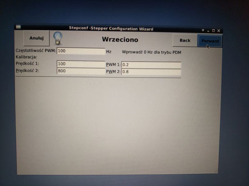 We configure the spindle (frequency and 2 values which PWM value corresponds to which speed - choose values and enter)