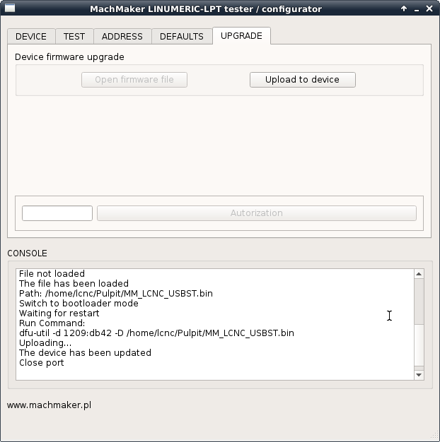 In the UPGRADE field you can update the Linumeric-LPT device software. If the manufacturer makes a new version of the software available, upload the binary file by clicking the Open firmware file button and save it to the device by clicking the Upload to device button. After programming, the device disconnects from the app and resets.