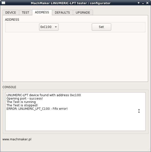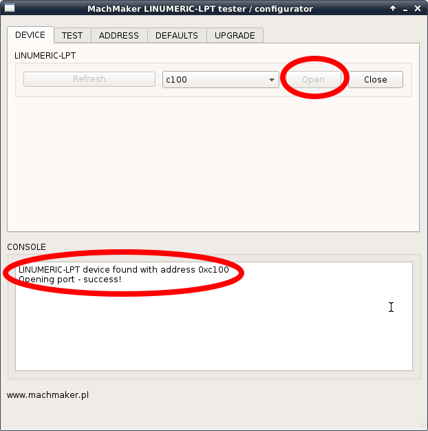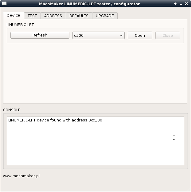 The LINUMERIC-LPT field should show the connected Linumeric-LPT devices displaying your address (in this case c100). To open the selected port, click the Open button.