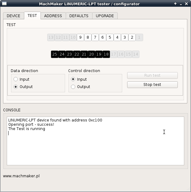 If everything works, the device is ready to work with LinuxCNC. We close Linumeric-LPT configurator before starting LinuxCNC.