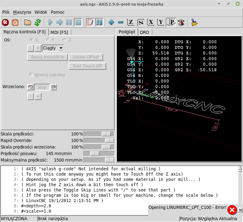 Since the error signaling itself on the device could not be noticed, an additional error message is displayed in the LinuxCNC software. Errors are displayed in the lower right corner.