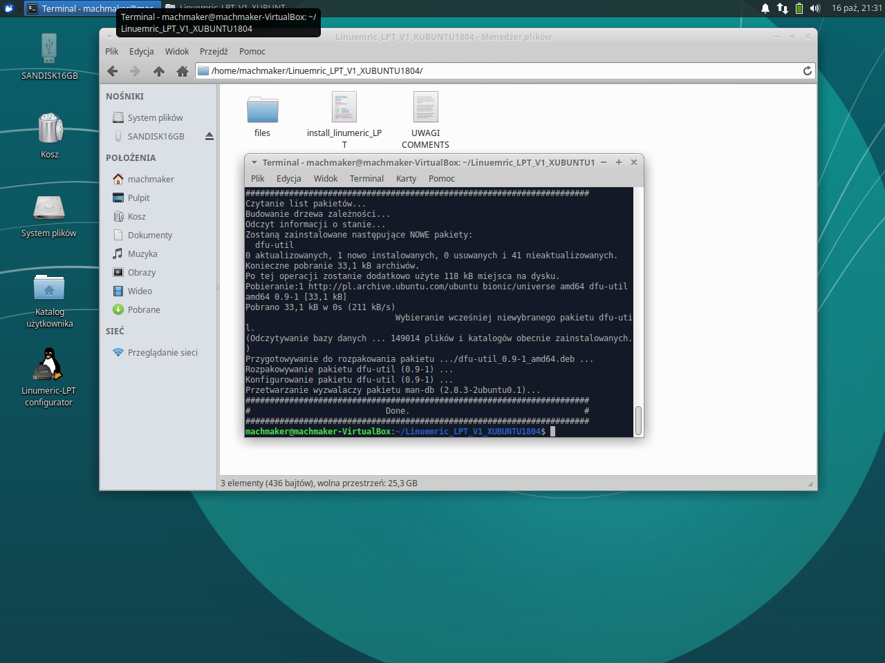 Aby zainstalować Linumeric-LPT należy pobrać paczkę LINUMERIC_LPT_V1_XUBUNTU1804.tar.gz i umieścic w katalogu użytkownika. Następnie należy rozpakować paczkę do katalogu o nazwie np. takiej jak archiwum (uwaga, nie należy stosować w nazwie spacji). Po rozpakowaniu plik archiwum można usunąć.