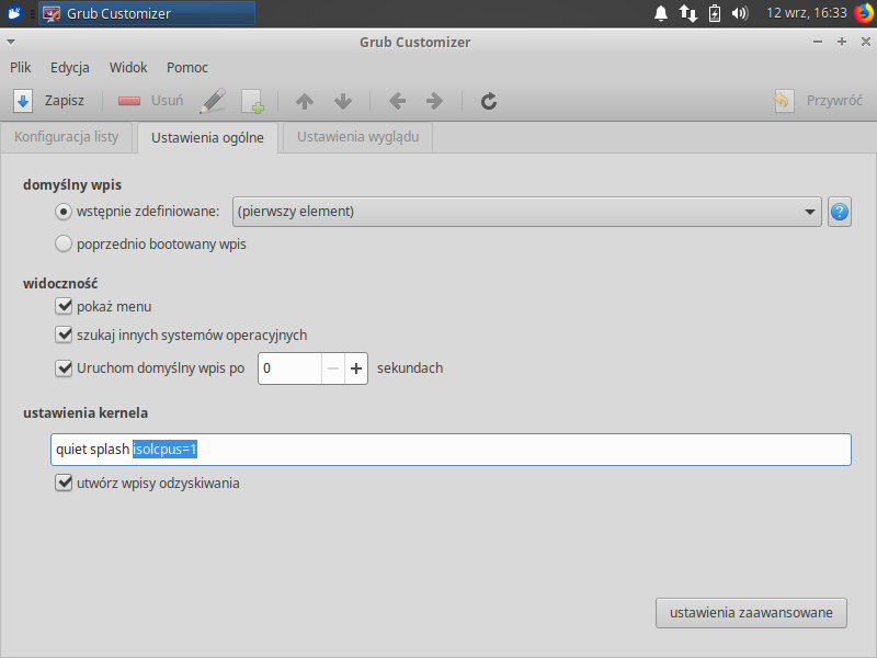 Go to the general settings tab and enter which core to isolate. The isolcpus command is responsible for this. Note, the cores are numbered from 0, so if we have, for example, 4 cores, they have the numbers 0, 1, 2, 3 and then enter the number 3. If the processor has, for example, 4 cores and each core supports 2 threads, we have 8 cores and then we enter the last 2 numbers, i.e. 6.7.