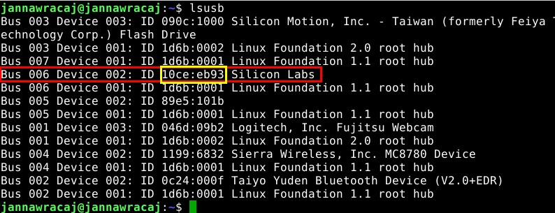 Wyświetli się lista urządzeń a między innymi nasze urządzenie (zaznaczone w czerwonej ramce). Jeśli urządzenie się nie wyświetla, to należy sprawdzić czy jest poprawnie podłączone lub ewentualnie uruchomić ponownie komputer i powrócić do polecenia lsusb)