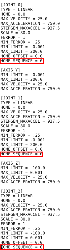 Sprawdzamy jeszcze, czy mamy ustawioną sekwencję bazowania. W pliku ini definiuje się te w dodając parametr HOME_SEQUENCE dla każdej osi. Jeśli w ustawieniach twojej maszyny jest już takie ustawienie to nie musisz nic robić. Jeśli natomiast nie masz ustawionych sekwencji bazowania wklej następującą wartość dla każdej z osi: